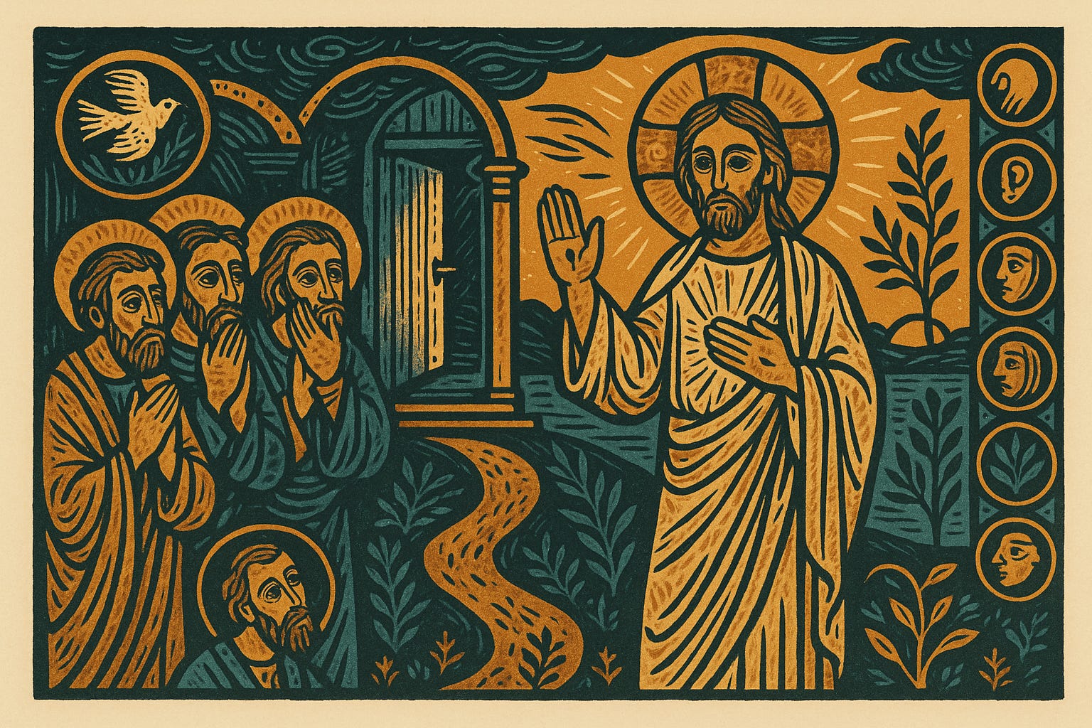 Me gusta pensar que, esa tarde, algunos discípulos debieron repetir la frase de memoria mientras el Maestro salía del cuarto y ellos se quedaban con tareas sencillas: poner la mesa, traer pan, abrir una ventana. Tal vez la paz crece precisamente ahí: en el oficio humilde de cuidar la casa y preparar el camino. Más tarde vendrá el envío abierto y el soplo que capacita, pero hoy la paz hace de puente. No nos aísla del mundo; nos pacifica para entrar en él con otra clase de valentía.