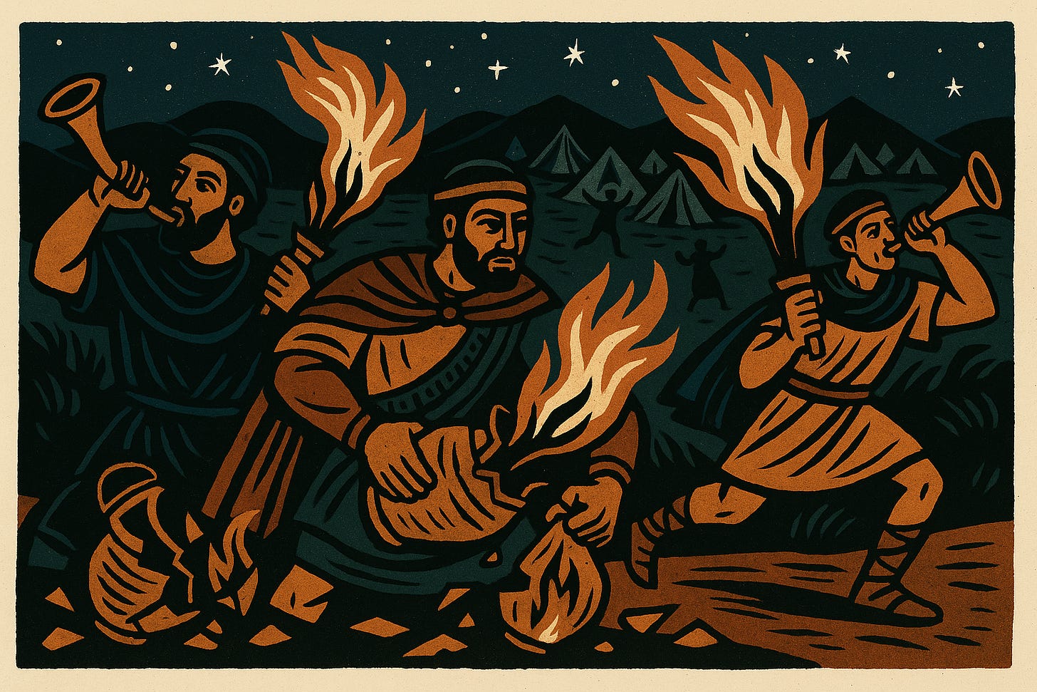 Sigue una escena extraña y hermosa. “Gedeón dividió a los trescientos hombres en tres compañías y distribuyó entre todos ellos trompetas y cántaros vacíos, con antorchas dentro de los cántaros.” (Jueces 7:16, NVI). No hay espadas relucientes ni carros; hay música y barro, luz escondida y vasijas quebradizas. Es como si Dios dijera: voy a salvarlos con aquello que el mundo desprecia. La instrucción es precisa: “Cuando todos los que están conmigo y yo toquemos nuestras trompetas, ustedes también toquen las suyas alrededor del campamento y digan: “Por el Señor y por Gedeón”».” (Jueces 7:18, NVI). La victoria, si llega, debe oler a Nombre y a obediencia, no a protagonismo.